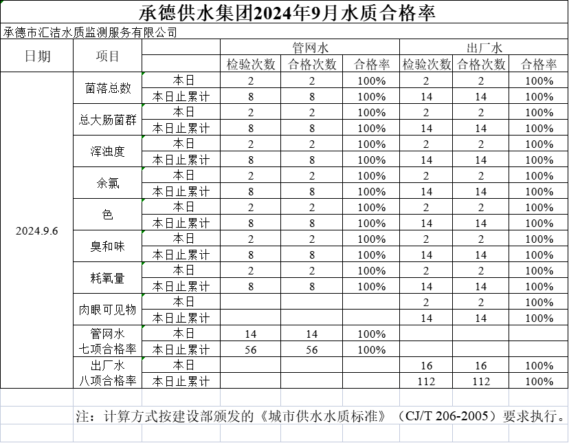 承德供水集團(tuán)2024年9月6日水質(zhì)合格率